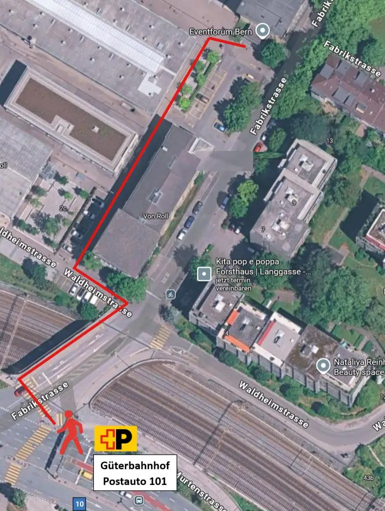 Dank der zentralen Lage erreichen Sie das Eventforum Bern schnell und unkompliziert mit den öffentlichen Verkehrsmitteln. Ab Hauptbahnhof Bern bringt Sie die PostAuto-Linie 101 direkt zur Haltestelle Güterbahnhof. Von dort führt ein kurzer Fussweg über die Brücke direkt zu unserem Eingang.
