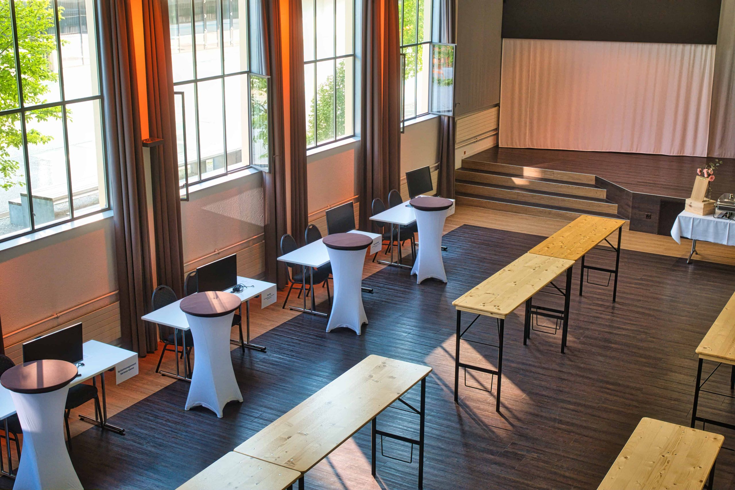 Wir stellen passende Bestuhlungsvarianten, Stehtische, Podeste und mobile Elemente zusammen und übernehmen auf Wunsch auch Umstellungen während des Events.