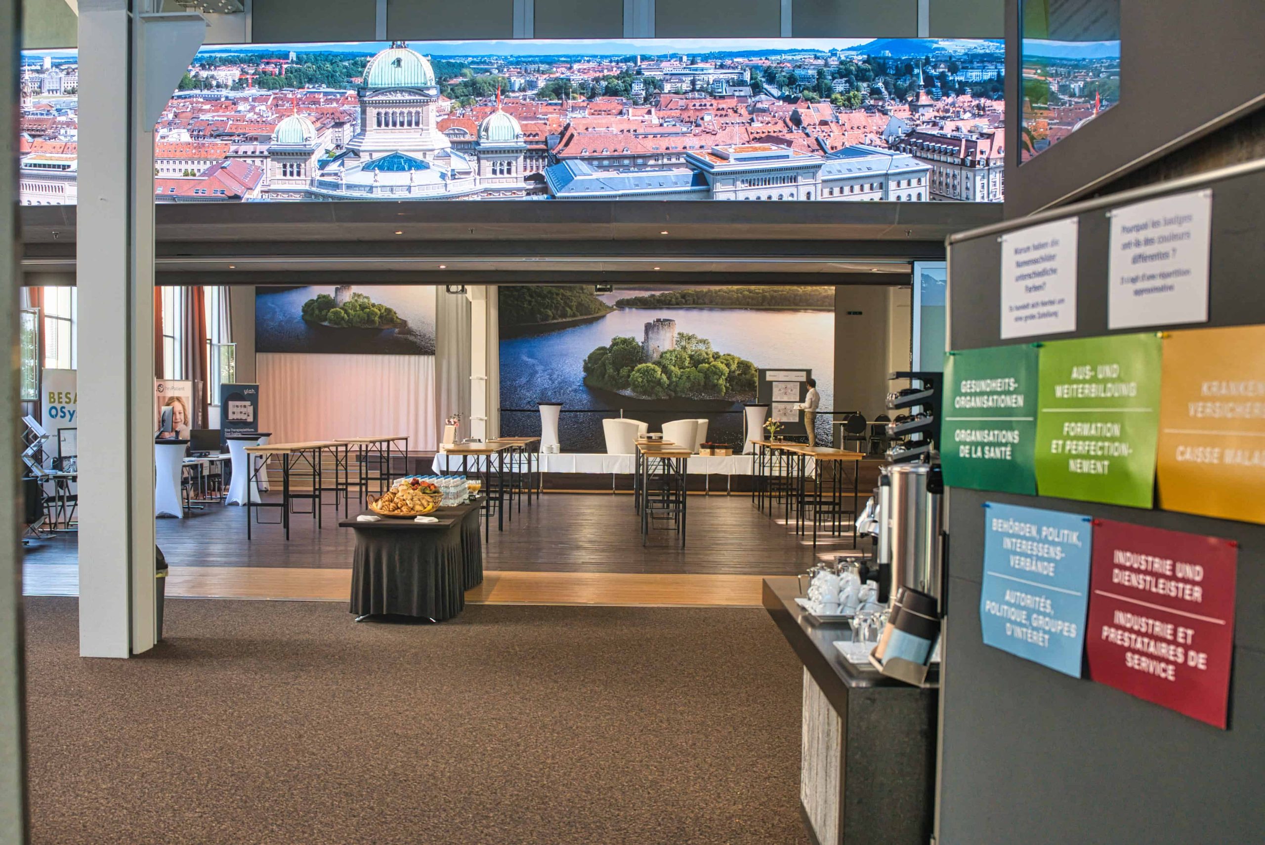 Für interaktive Workshops stehen Pinnwände, Posterflächen, Flipcharts, Whiteboards und mobile Möbel bereit. So können Gruppenarbeiten, Breakout‑Sessions und Design‑Thinking‑Phasen ohne zusätzliche Aufbauten durchgeführt werden.