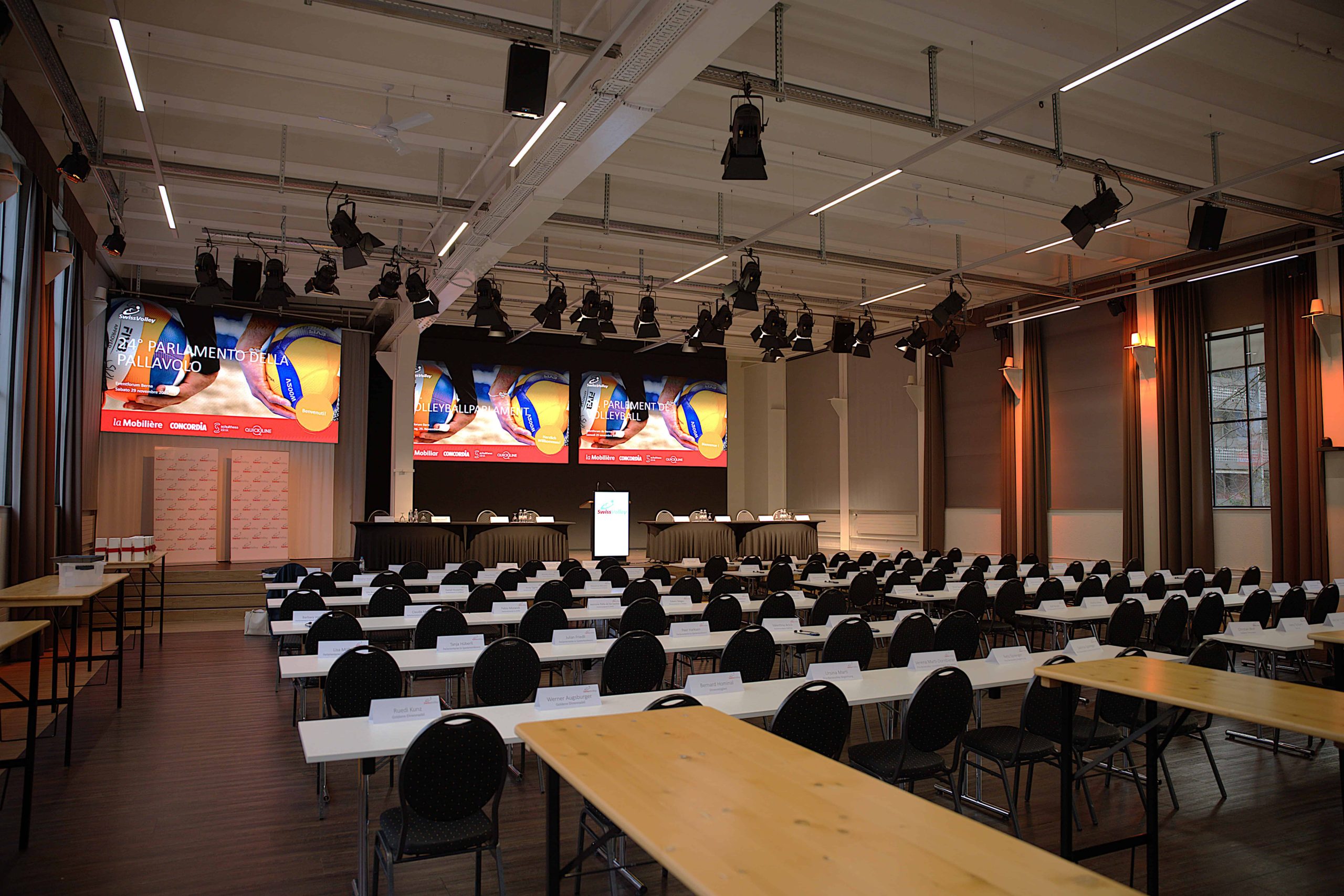 Im Eventforum Bern steht Ihnen vielseitiges Eventmobiliar zur Verfügung, das Sie je nach Veranstaltungsformat flexibel kombinieren können – von Seminaren und Workshops bis zu Networking-Events. Unsere Ausstattung unterstützt Sie dabei, Raumlayouts effizient zu planen, Konferenzen komfortabel umzusetzen und Gäste professionell zu empfangen.